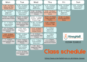 Here is a template of all the classes at Viney Hall, but you need to look on our online booking system (link below) for full details:
